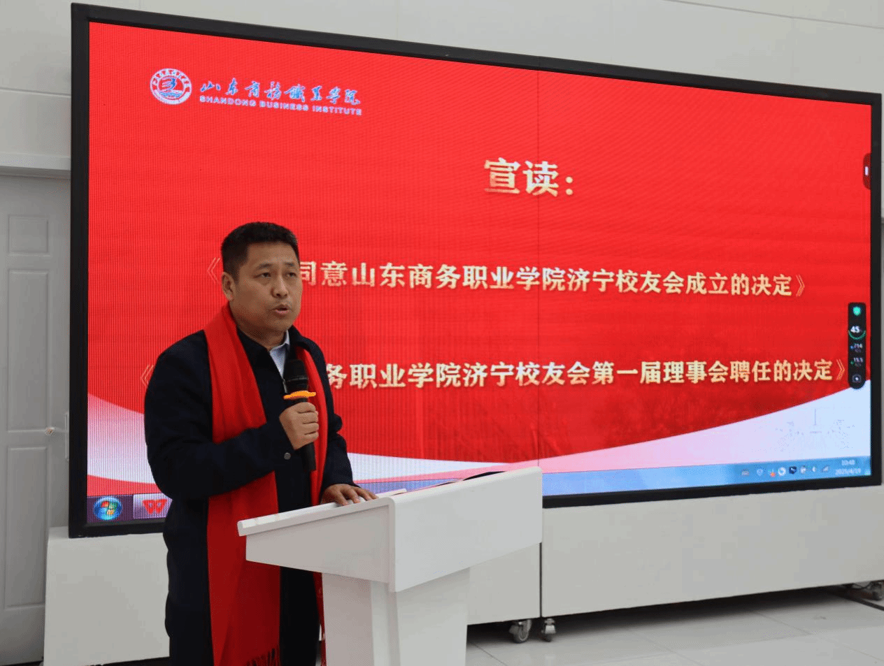 宫国学宣读了《关于同意山东商务职业学院济宁校友会成立的决定》以及《关于山东商务职业学院济宁校友会第一届理事会聘任的决定》。