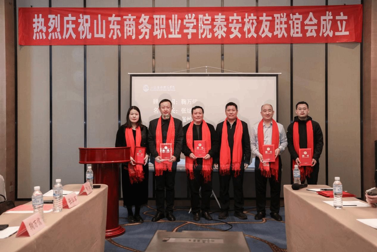 宫国学宣读了《关于同意山东商务职业学院泰安校友会成立的决定》以及《关于山东商务职业学院泰安校友会第一届理事会聘任的决定》,并为泰安校友会第一届理事会成员颁发了聘书。