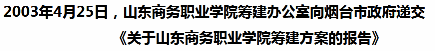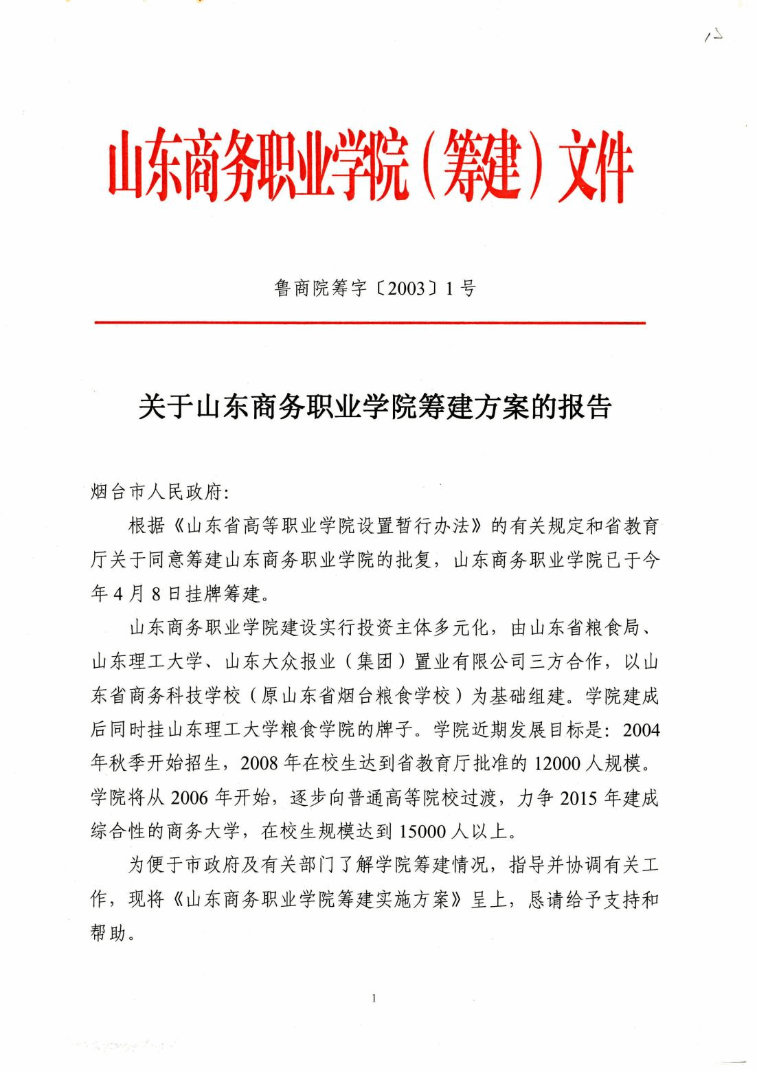 2003年4月25日,山东商务职业学院筹建办公室专门向烟台市人民政府递交了《关于山东商务职业学院筹建方案的报告》。报告提出学校近期发展目标是:2004年秋季开始招生,2008年在校生达到省教育厅批准的12000人规模;从2006年开始,逐步向普通高等院校过渡,力争2015年建成综合性商务大学,在校生规模达到15000人以上。依据学校当前批准规模12000人、2015年发展目标15000人的实际需要,计划征地1500亩。新征土地全部用于新校区建设,其中教学区用地700亩,学生及教职工生活区用地600亩,学院科技园用地200亩。整个学院建设分两期完成,2006年完成一期工程,包括征地1500亩,完成建筑物20万平方米,投资3亿元。2010年完成二期工程,新增建筑物10万平方米,追加投资1.5亿元。