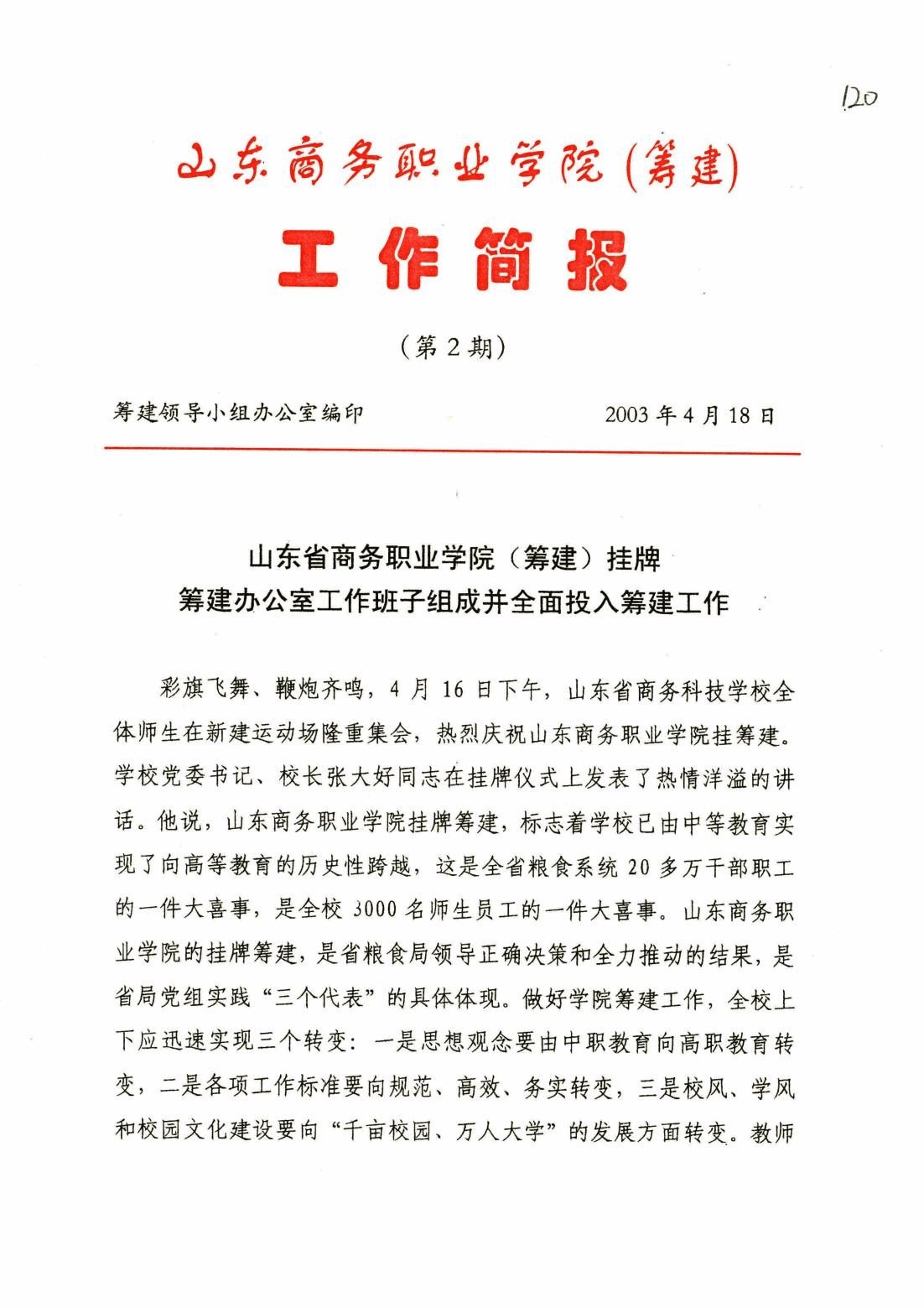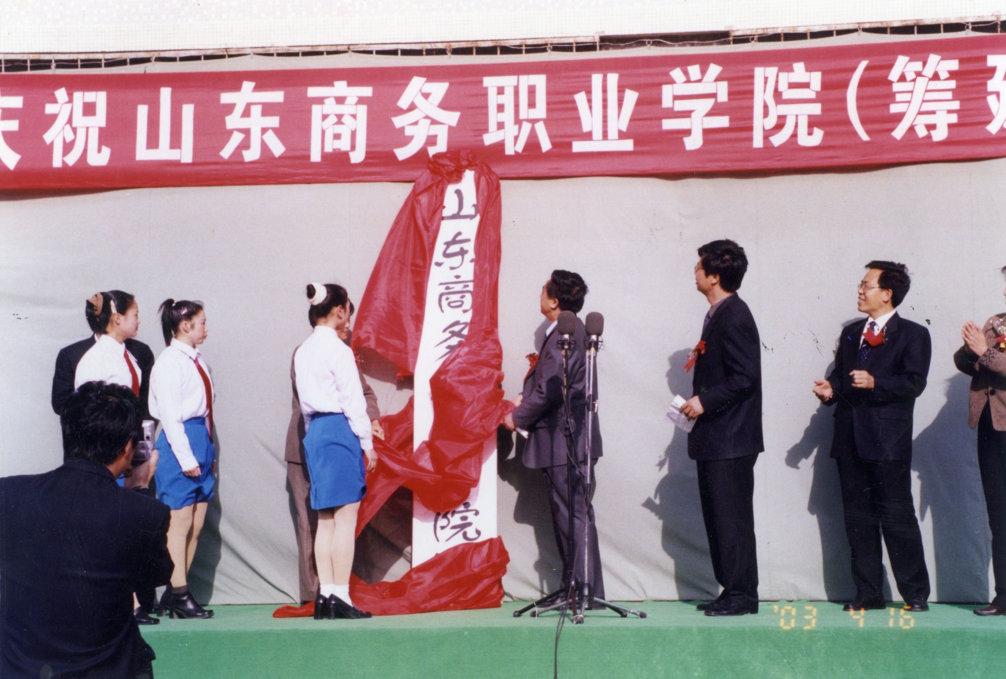 2003年4月8日,山东省粮食局正式向山东省教育厅递交了《关于筹建山东商务职业学院的请示》,山东省教育厅以“鲁教计函〔2003〕11号”,于当日批复山东省粮食局:“同意你局与山东理工大学和山东大众置业有限公司合作,以山东省商务科技学校为基础筹建山东商务职业学院。山东商务职业学院全日制在校生规模暂定为12000人。”2003年4月8日,山东商务职业学院正式挂牌筹建。4月16日下午,学校全体师生在新建运动场隆重集会,热烈庆祝山东商务职业学院挂牌筹建。山东商务职业学院筹建办公室也于4月17日正式组建。