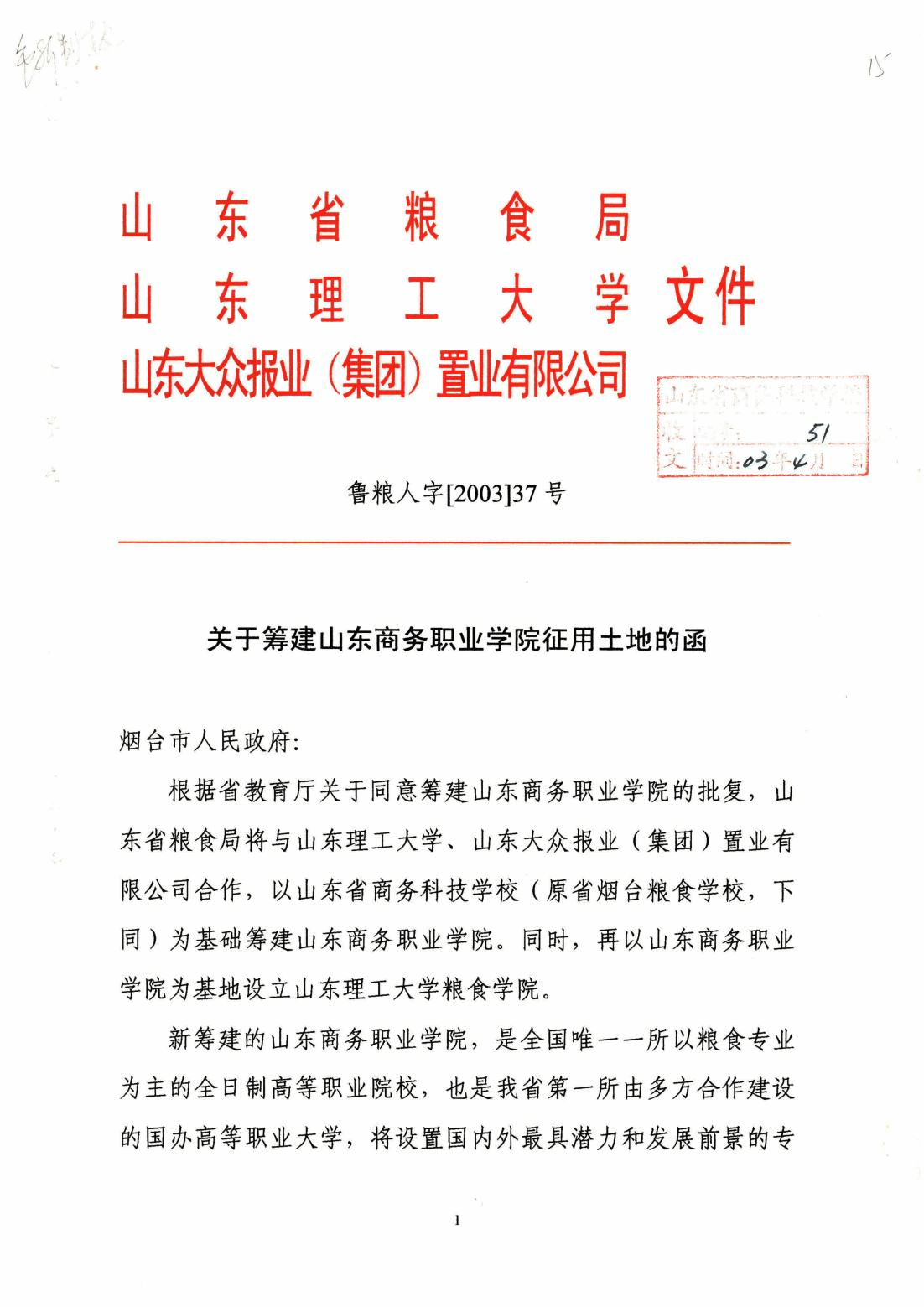 在2003年4月9日—10日、4月12日,两次充分考察论证的基础上,2003年4月16日,山东省粮食局、山东理工大学、山东大众报业(集团)置业有限公司联合行文,向烟台市政府提出申请,在莱山区马山工业园以西、烟威高速路以南征地1500亩,用于新建山东商务职业学院和山东理工大学粮食学院。