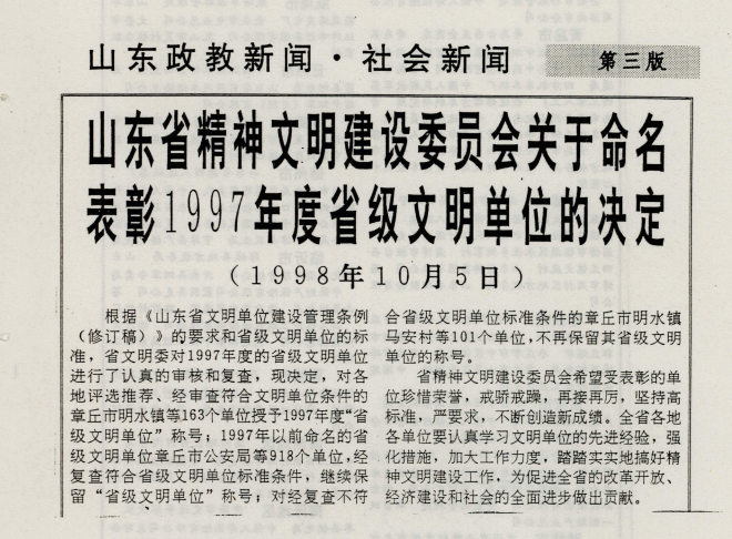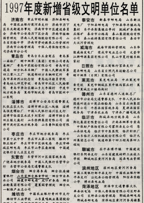 1998年10月5日,根据《山东省文明单位建设管理条例(修订稿)》,在对1997年度省级文明单位进行了充分审核和认真复查后,山东省精神文明建设委员会决定对符合条例条件的163个单位授予1997年度“省级文明单位”称号。山东省烟台粮食学校荣耀登榜。