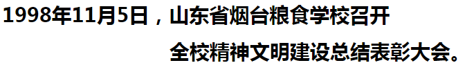 “省级文明单位”是学校自1992年起,连续被烟台市委、市政府授予“文明精神”单位后的重大突破。为勉励师生、勠力前行,山东省烟台粮食学校于1998年11月5日,隆重召开了全校精神文明建设总结表彰大会。