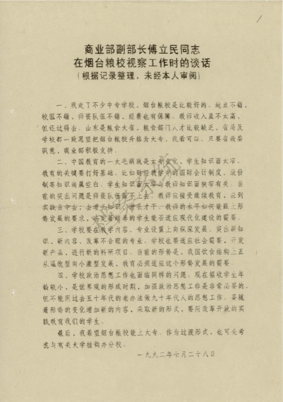 1992年7月28日,商业部副部长傅立民在山东省粮食局副局长丁宗山的陪同下来校视察。期间,傅立民对我校的整体办学水平给予了高度评价,并提出了四点意见。他不仅肯定了我校的各项工作,还对学校的地理位置、校园环境及师资队伍等方面予以赞扬。同时,他围绕学校教育改革、教学内容、专业设置及思想政治工作等方面提出了指导性意见。傅立民指出,山东作为农业大省,粮食产业是重要行业,但粮食教育事业的发展远滞后于经济发展需求,亟须大力推进。他明确表示,烟台粮校办学成效显著,支持我校升格为大专院校。